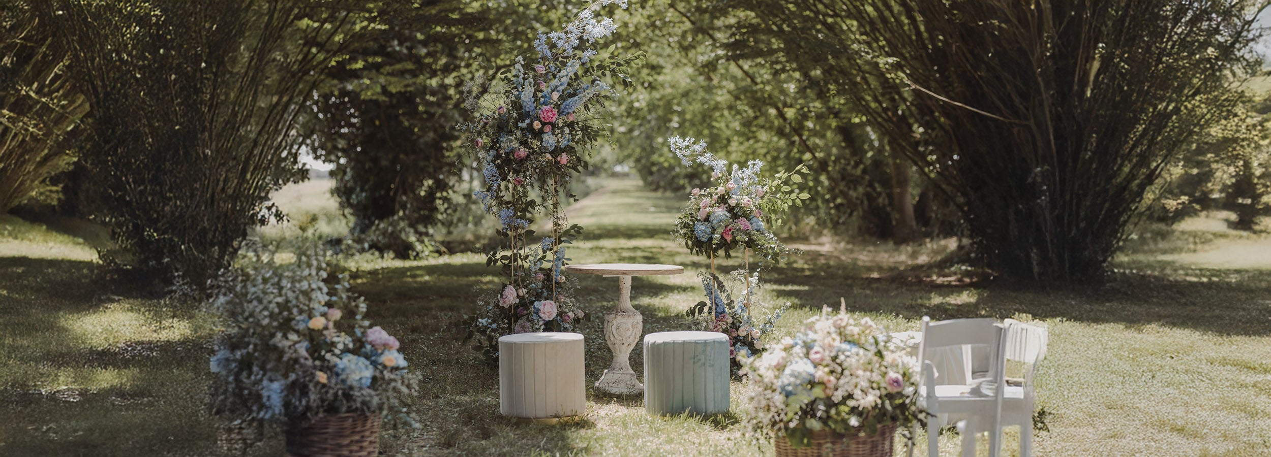Archi romantici intrecciati di fiori selvatici e spighe di grano vi accolgono sotto un cielo aperto, in un’atmosfera che profuma di semplicità, eleganza e libertà. Ogni dettaglio, dalle sedute in legno bianco alle ghirlande luminose sospese tra i rami, crea una scenografia naturale e raffinata, dove il tempo sembra rallentare per lasciar spazio alle emozioni più vere.